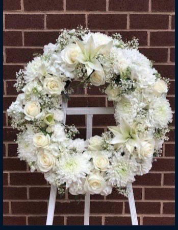 Coroana funerara de 50 cm cu trandafiri,crini, crizanteme, gypsophila,