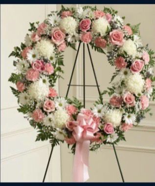 Coroana funerara 70 cm cu trandafir, gerbera, crizanteme si feriga