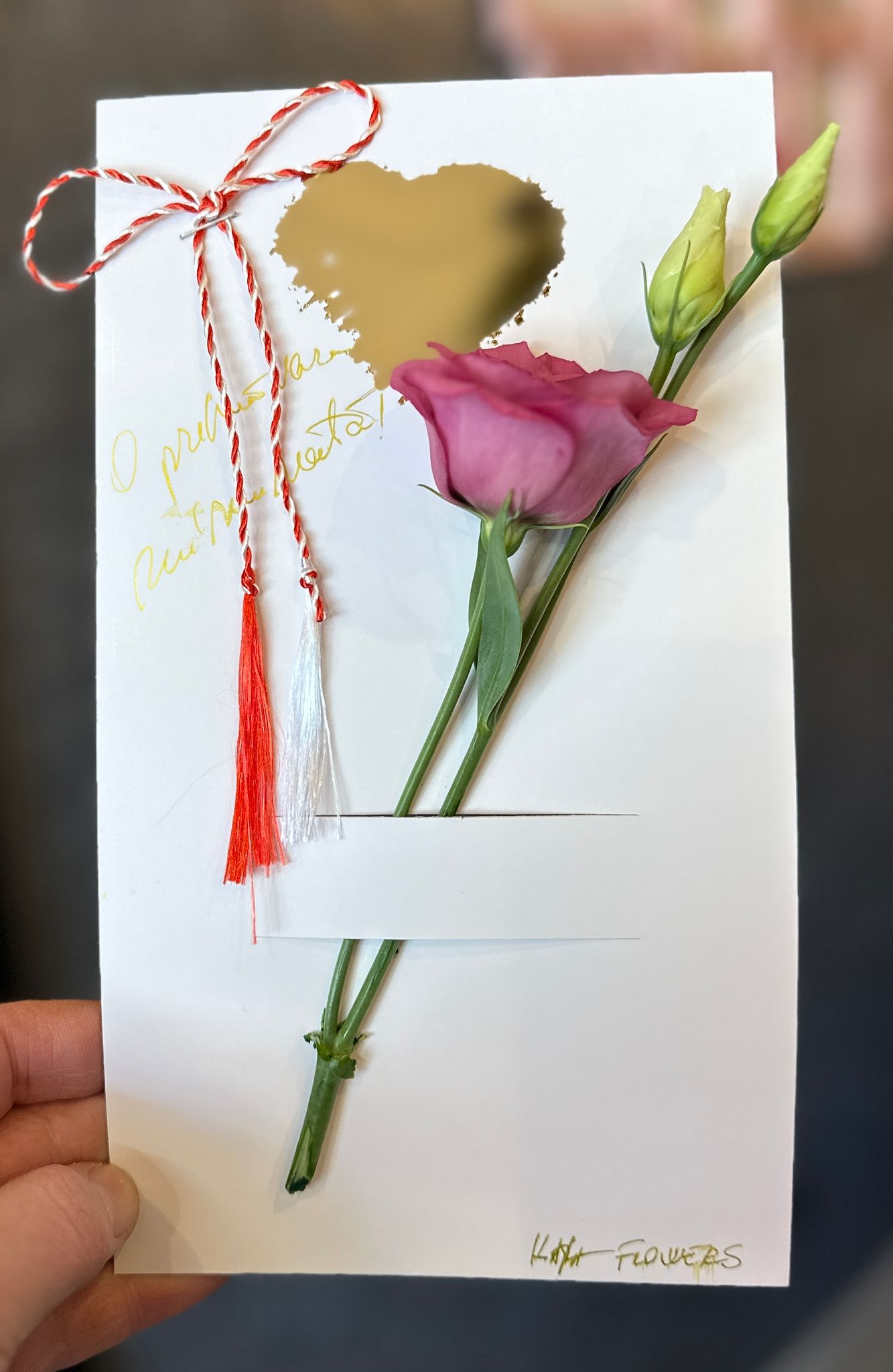 Pachet de 10 buc cu lisianthus pe carton cu snur martisor, nuante flori la alegere. Comanda minima 10 buc 30 lei buc