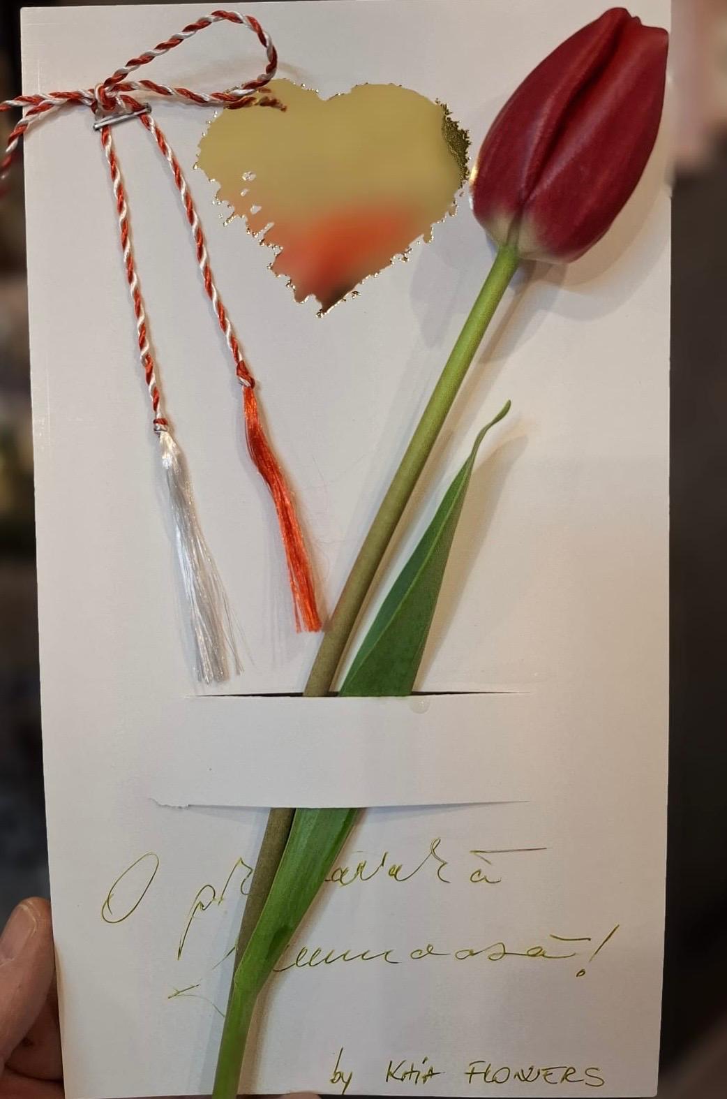 Martisor lalea 1 fir, pe carton cu snur martisor. Nuante flori la alegere. Comanda minima 10 Bucati, 20 lei buc.